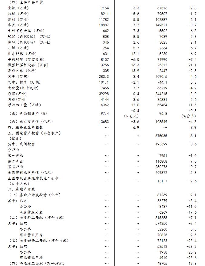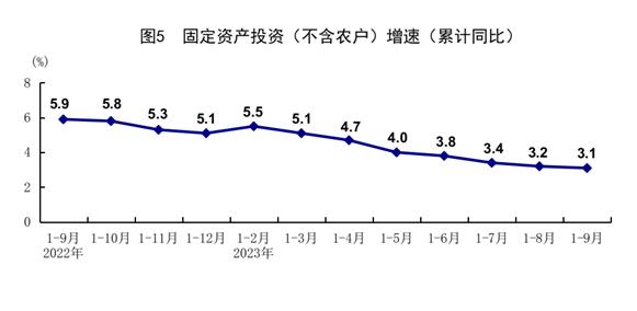 前三季度,全国固定资产投资(不含农户)375035亿元,同比增长3.1%;扣除价格因素影响,同比增长6.0%。分领域看,基础设施投资同比增长6.2%,制造业投资增长6.2%,房地产开发投资下降9.1%。全国商品房销售面积84806万平方米,同比下降7.5%;商品房销售额89070亿元,下降4.6%。分产业看,第一产业投资同比下降1.0%,第二产业投资增长9.0%,第三产业投资增长0.7%。民间投资下降0.6%;扣除房地产开发投资,民间投资同比增长9.1%。高技术产业投资同比增长11.4%,其中高技术制造业和高技术服务业投资分别增长11.3%、11.8%。高技术制造业中,航空、航天器及设备制造业,医疗仪器设备及仪器仪表制造业投资分别增长20.7%、17.0%;高技术服务业中,科技成果转化服务业、专业技术服务业投资分别增长38.8%、29.6%。9月份,固定资产投资(不含农户)环比增长0.15%。