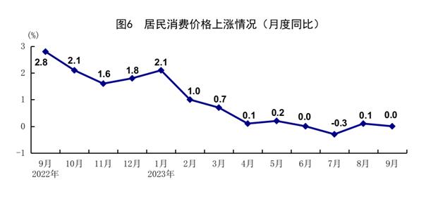 前三季度,全国居民消费价格(CPI)同比上涨0.4%。分类别看,食品烟酒价格上涨1.1%,衣着价格上涨0.9%,居住价格下降0.1%,生活用品及服务价格上涨0.2%,交通通信价格下降2.4%,教育文化娱乐价格上涨1.9%,医疗保健价格上涨1.1%,其他用品及服务价格上涨3.2%。在食品烟酒价格中,猪肉价格下降6.8%,鲜菜价格下降3.1%,粮食价格上涨1.2%,鲜果价格上涨6.0%。扣除食品和能源价格后的核心CPI同比上涨0.7%。9月份,全国居民消费价格同比持平,环比上涨0.2%。
