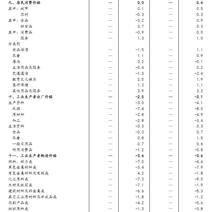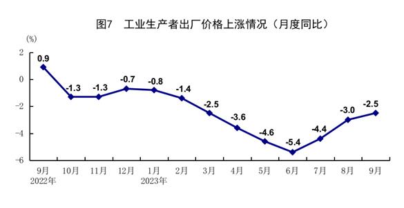 前三季度,全国工业生产者出厂价格同比下降3.1%。其中,9月份同比下降2.5%,降幅比上月收窄0.5个百分点,环比上涨0.4%。前三季度,工业生产者购进价格同比下降3.6%。其中,9月份同比下降3.6%,降幅比上月收窄1.0个百分点,环比上涨0.6%。