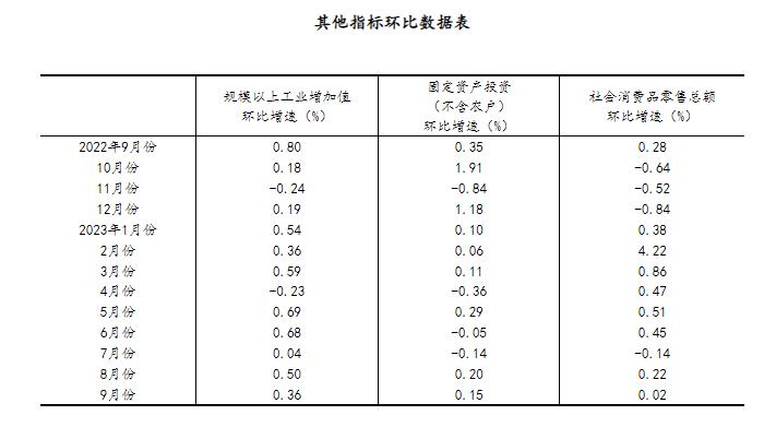 (2)根据季节调整模型自动修正结果,对近一年来各期国内生产总值、规模以上工业增加值、固定资产投资(不含农户)、社会消费品零售总额环比增速进行修订。修订结果及2023年三季度GDP环比数据、2023年9月份其他指标环比数据如下: