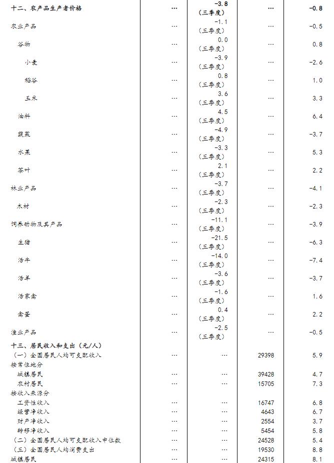 前三季度,农业(种植业)增加值同比增长3.6%。全国夏粮产量14613万吨,比上年下降0.9%,产量居历史第二高位;早稻产量2834万吨,增长0.8%。秋粮播种面积稳中有增,长势总体正常,全国粮食有望再获丰收。前三季度,猪牛羊禽肉产量6974万吨,同比增长3.9%,其中猪肉、牛肉、羊肉、禽肉产量分别增长3.6%、5.0%、5.2%、4.0%;牛奶产量增长7.2%,禽蛋产量增长2.1%。三季度末,生猪存栏44229万头,同比下降0.4%。前三季度,生猪出栏53723万头,增长3.3%。