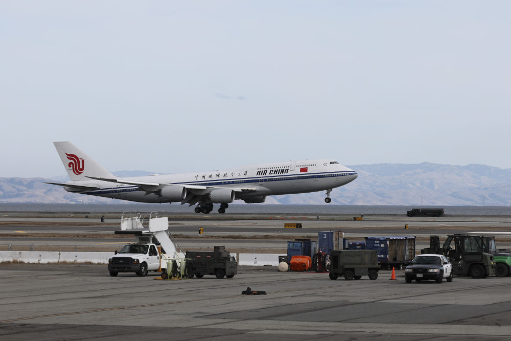 习近平乘坐专机抵达旧金山国际机场时,受到美国加利福尼亚州州长纽森、财政部长耶伦等美方代表热情迎接。