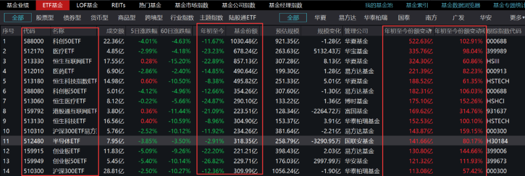 如果放眼全市场ETF,截至12月18日,今年以来共有14只ETF份额增长在100亿份以上,除了上述两只科创50ETF产品外,更多是来自港股互联网、医疗、半导体、创业板等领域的产品。