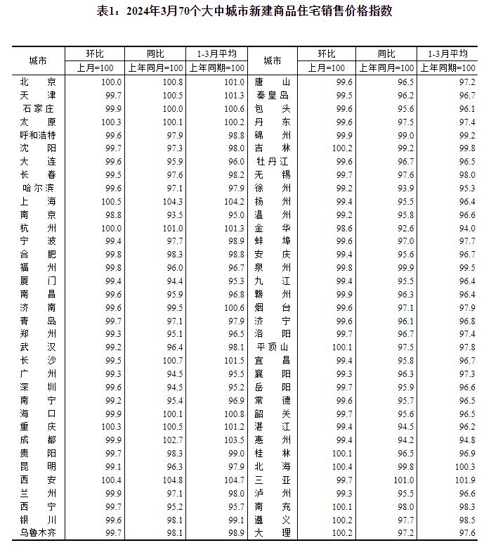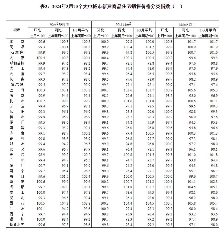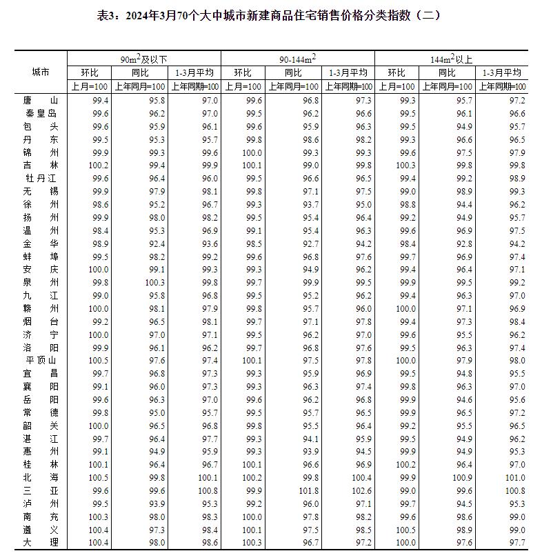 2024年3月份70个大中城市商品住宅销售价格变动情况