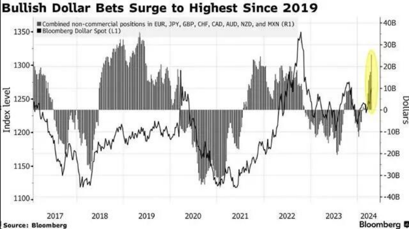 彭博美元指数今年上涨了4%以上,反映出美元兑所有主要发达国家和新兴市场货币的上涨。根据美国商品期货交易委员会的数据,一项衡量交易员情绪的流行指标在今年年初指向看跌,但自那以来,看涨美元的押注飙升至2019年以来的最高水平。
