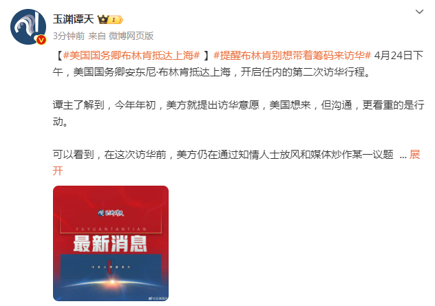@玉渊潭天 微博消息,4月24日下午,美国国务卿安东尼·布林肯抵达上海,开启任内的第二次访华行程。