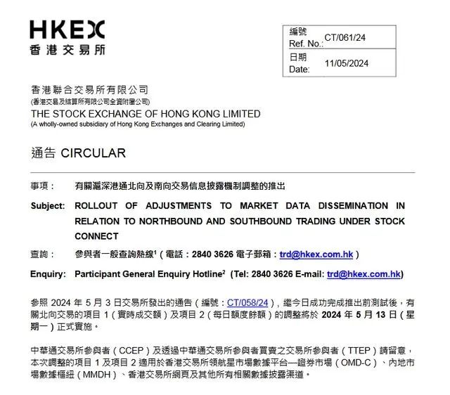 5月11日,港交所公告,参照2024年5月3日交易所发出的通告,继5月11日成功完成推出前测试后,有关北向交易的实时成交额及每日额度余额的调整将于5月13日(星期一)正式实施。