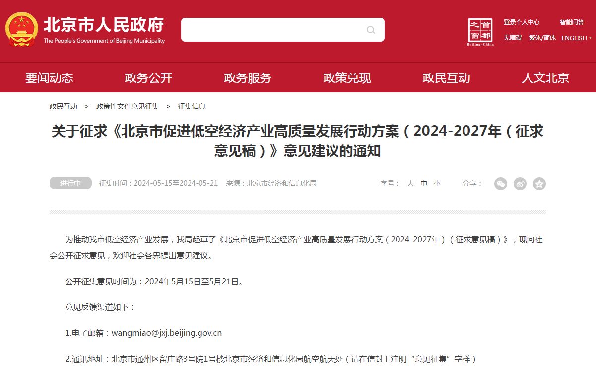《北京市促进低空经济产业高质量发展行动方案(2024—2027年)》公开征求意见。其中提到,创新并开放多元应用场景。应急救援方面,加快房山基地建设,推进通用航空在全市开展应急通讯、消防灭火、巡检巡查等领域应用示范。物流配送方面,依托延庆八达岭机场开通西北物流支线等航线,构建无人机+公交物流配送新模式。城际通勤方面,建立大兴机场与雄安新区,首都机场与天津、廊坊等地区的通勤航路航线,探索分体式飞行汽车城际通勤+城内摆渡应用新业态。特色文旅方面,在延庆、平谷、密云等区发展低空旅游、飞行体验等产业。