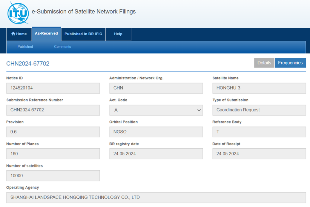 国际电信联盟近日公布一份数据资料,上海蓝箭鸿擎科技有限公司(以下简称“鸿擎科技”)向国际电信联盟提交了预发信息(API)。该资料提到了一个名为Honghu-3(中文应为“鸿鹄-3”)的星座计划,将在160个轨道平面上总共发射10000颗卫星。