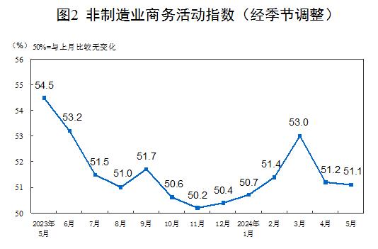 5月份,非制造业商务活动指数为51.1%,与上月基本持平,非制造业继续保持扩张。