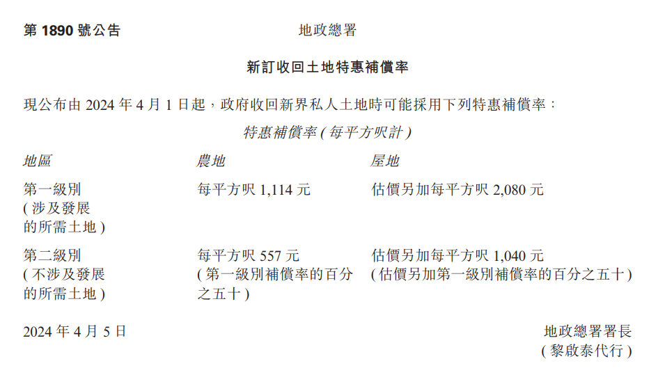 据香港地政总署数据,香港特区政府收回的土地主要分为两种补偿基准:一种是涉及开发商的土地,农地按照每平方呎(1平方呎≈0.09290304平方米)1114港元补偿,屋地估价另加每平方呎2080港元;若不涉及开发商的土地,农地则按照每平方呎557港元补偿,屋地估价另加每平方呎1040港元。