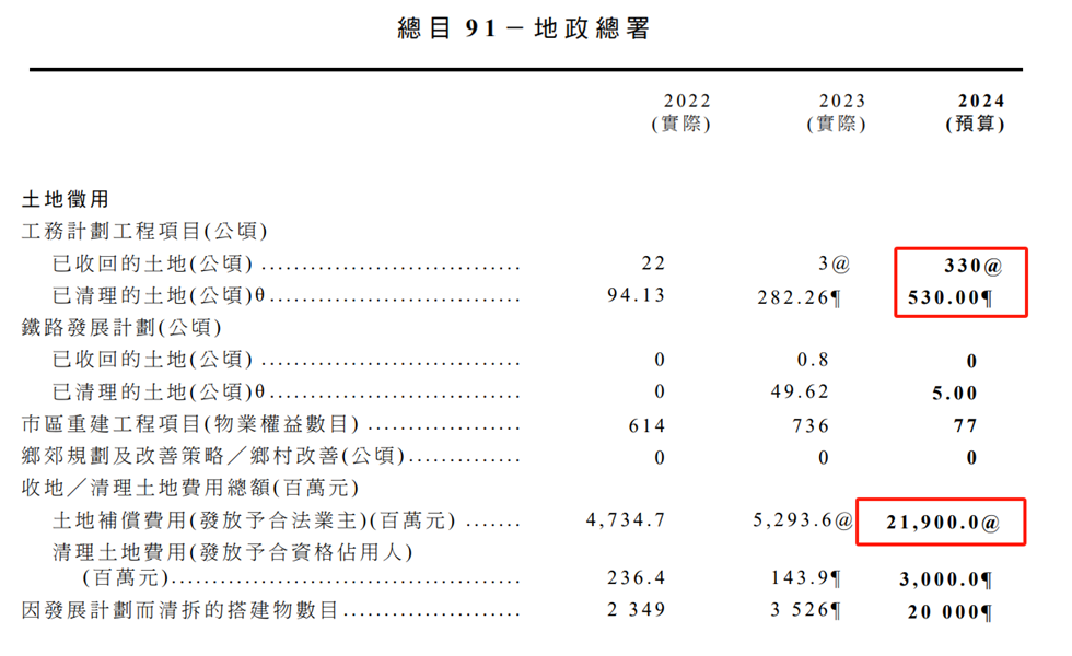 据香港地政总署数据,2022年,香港地政总署协助收回22公顷土地,清理94.13公顷土地,发放土地补偿费用约为47.35亿港元。2023年,收回3公顷土地,清理282.26公顷土地,发放土地补偿费用约为52.94亿港元。而在2024年的计划中,预计回收330公顷土地,清理530公顷土地,预计发放的土地补偿费用为219亿港元。