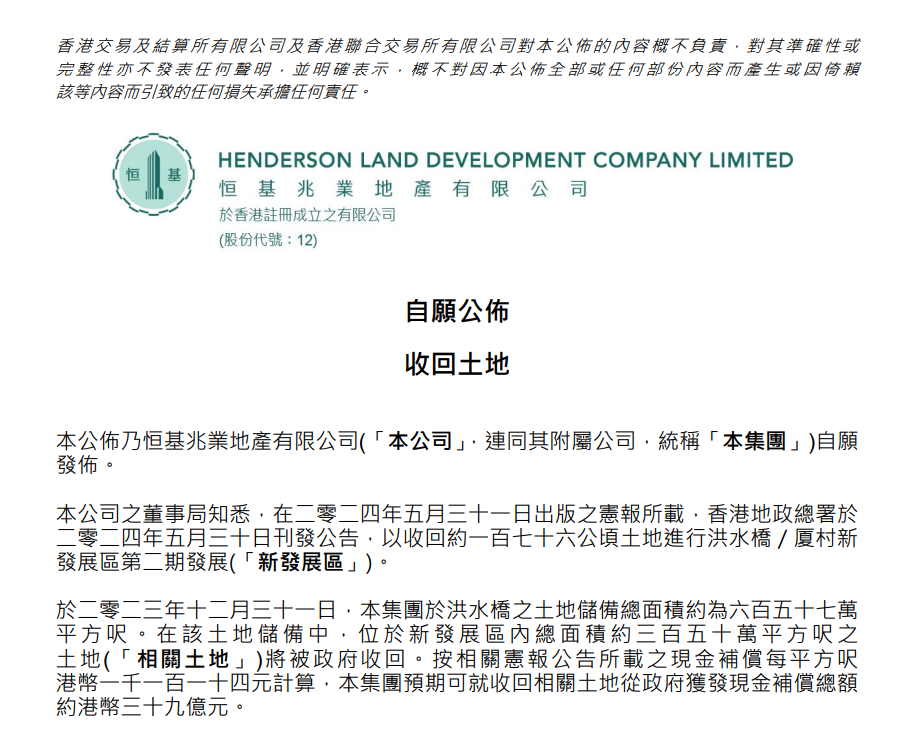 6月2日,恒基地产(HK000012,股价24.75港元,市值1198.2亿港元)公告称,旗下位于香港洪水桥/厦村新发展区第二期的土地将被政府收回,涉及面积约176公顷。