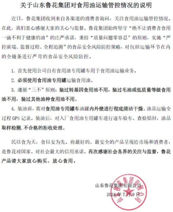 7月9日,鲁花集团发布声明称,公司对包括运输环节在内的全链条进行严苛食品安全风险防控,使用公司自有食用油专用罐车用于食用油运输业务。装油前对食用油专用罐车油罐内外壁进行彻底清洁干燥。装油后,对入厂食用油专用罐车进行逐车验车、查验铅封,油品取样检测,不合格的拒收处理。请大家放心购买、放心食用。