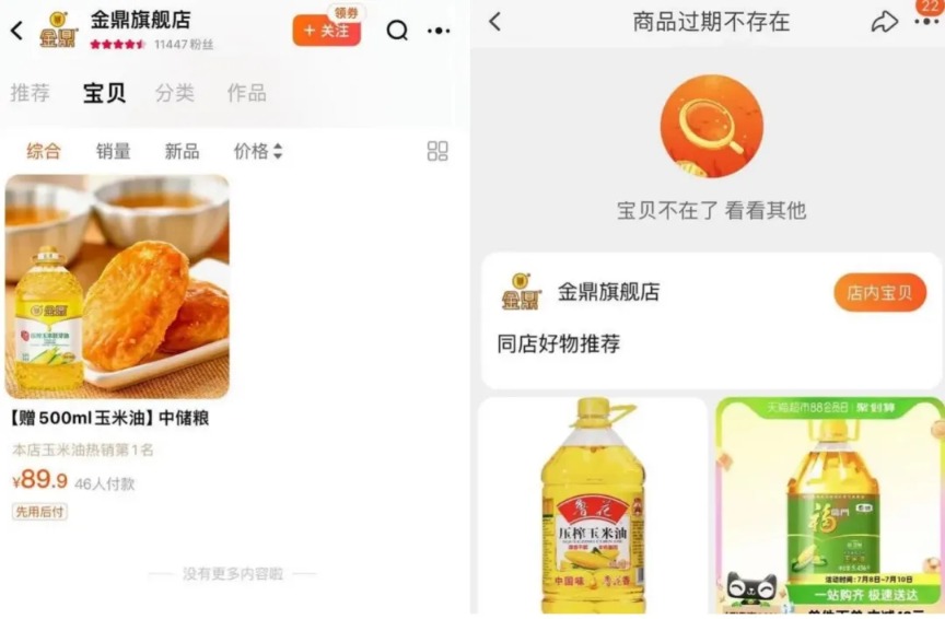 此外,券商中国记者今日发现中储粮旗下食用油品牌金鼎的淘宝旗舰店产品再次下架,而在京东和拼多多平台,均已搜索不到金鼎食用油相关店铺。