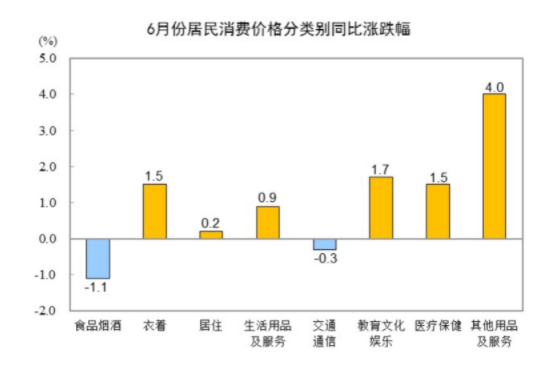 其他七大类价格同比六涨一降。其中,其他用品及服务、教育文化娱乐价格分别上涨4.0%和1.7%,衣着、医疗保健价格均上涨1.5%,生活用品及服务、居住价格分别上涨0.9%和0.2%;交通通信价格下降0.3%。