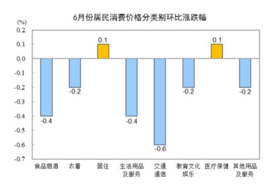6月份,全国居民消费价格环比下降0.2%。其中,城市下降0.2%,农村下降0.2%;食品价格下降0.6%,非食品价格下降0.2%;消费品价格下降0.4%,服务价格持平。