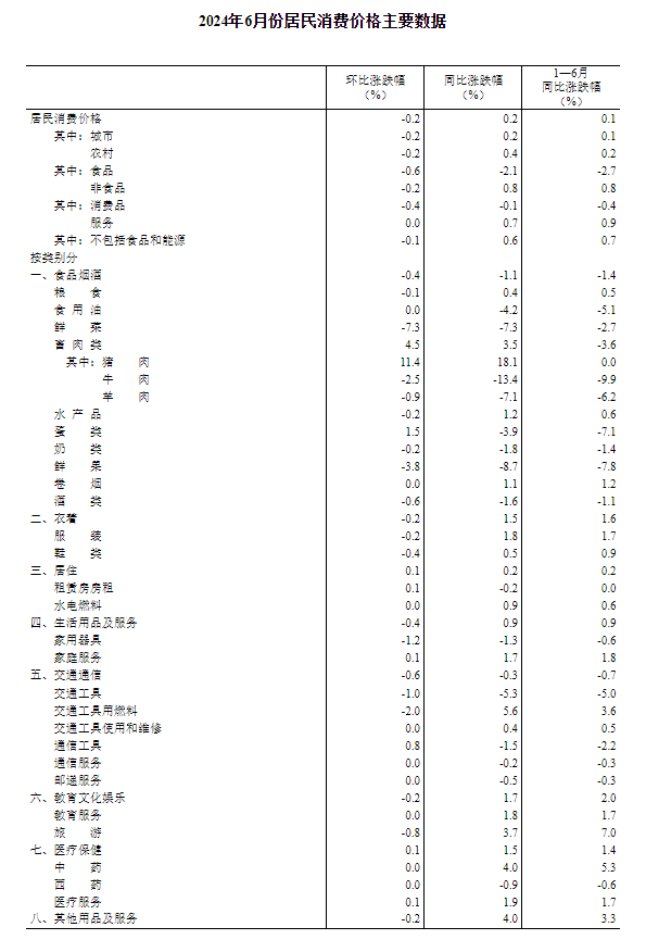 2024年6月份居民消费价格同比上涨0.2%
