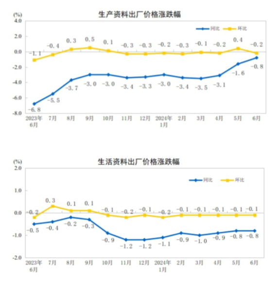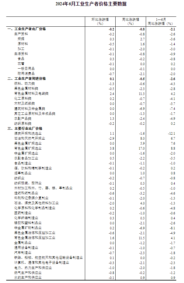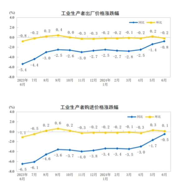 2024年6月份,全国工业生产者出厂价格同比下降0.8%,降幅比上月收窄0.6个百分点,环比由上月上涨0.2%转为下降0.2%;工业生产者购进价格同比下降0.5%,环比上涨0.1%。上半年,工业生产者出厂价格比上年同期下降2.1%,工业生产者购进价格下降2.6%。