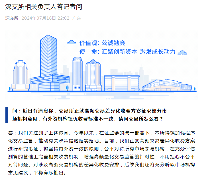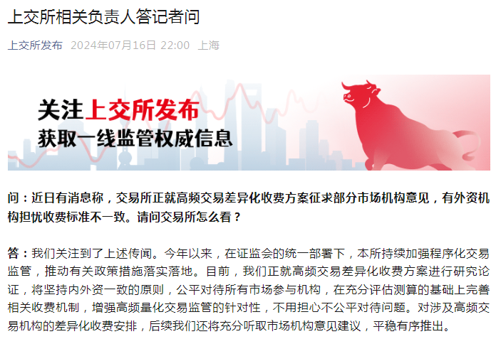 答:我们关注到了上述传闻。今年以来,在证监会的统一部署下,本所持续加强程序化交易监管,推动有关政策措施落实落地。目前,我们正就高频交易差异化收费方案进行研究论证,将坚持内外资一致的原则,公平对待所有市场参与机构,在充分评估测算的基础上完善相关收费机制,增强高频量化交易监管的针对性,不用担心不公平对待问题。对涉及高频交易机构的差异化收费安排,后续我们还将充分听取市场机构意见建议,平稳有序推出。
