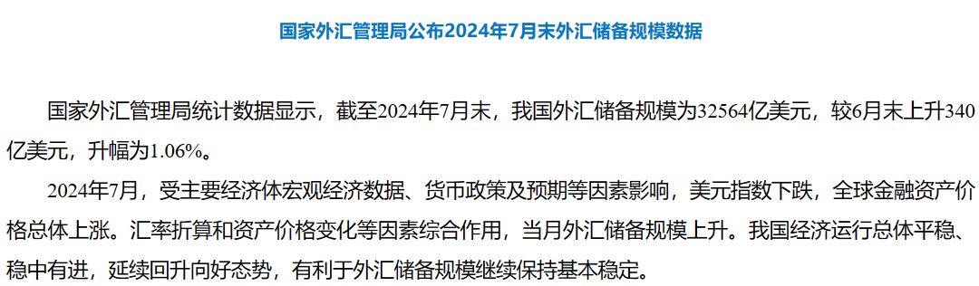 国家外汇管理局(下称“外汇局”)8月7日公布的2024年7月末外汇储备规模数据显示,7月末我国外汇储备规模为32564亿美元,较6月末上升340亿美元,升幅为1.06%,为年初以来环比最大升幅。