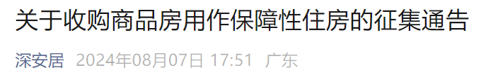 8月7日,深圳安居集团发布《关于收购商品房用作保障性住房的征集通告》。