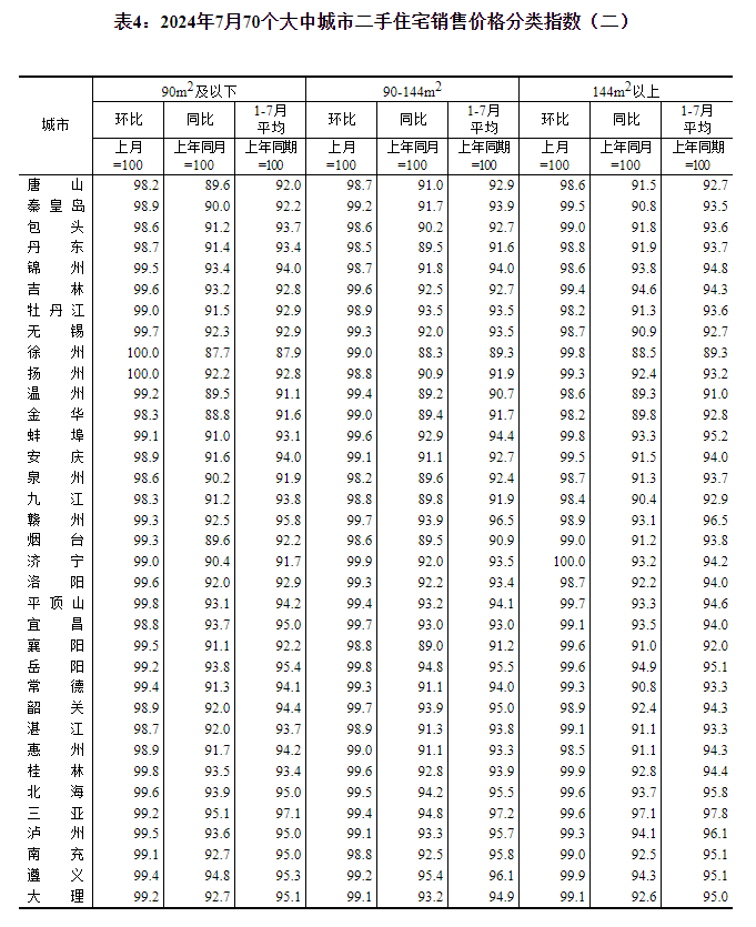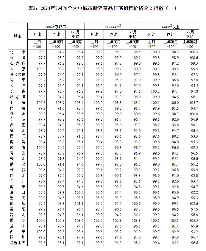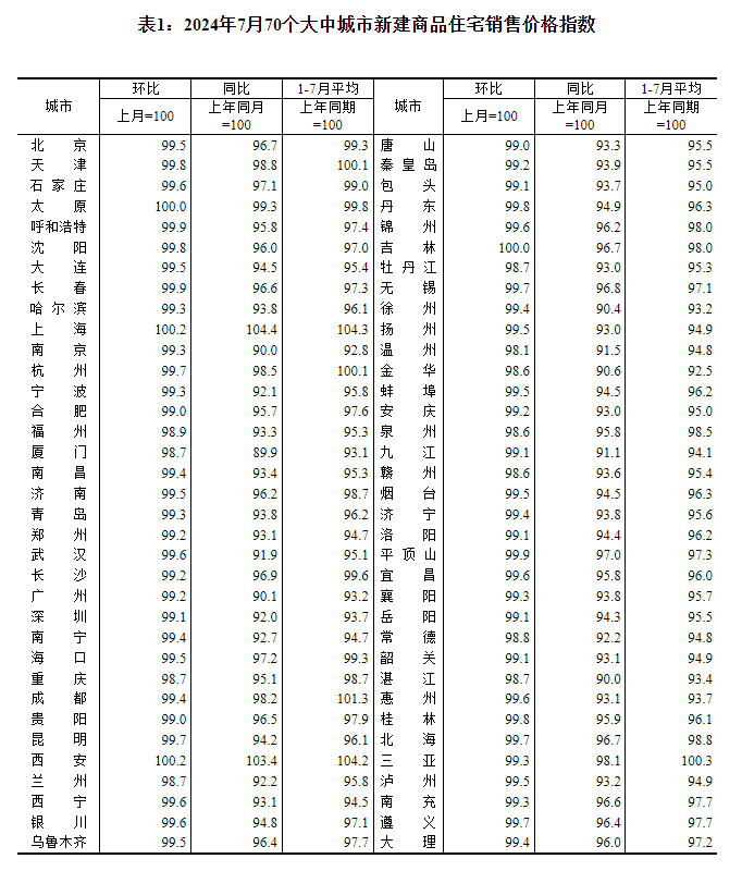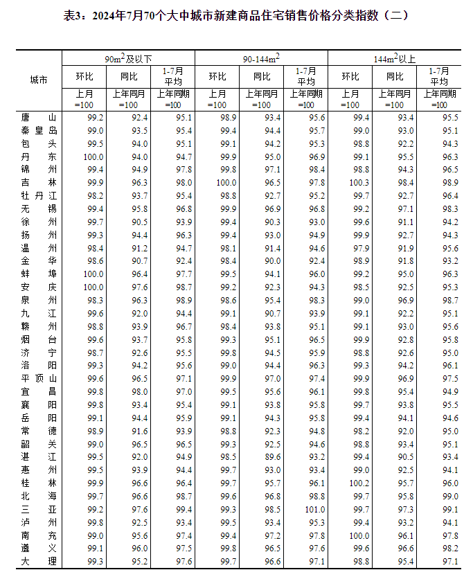 2024年7月份70个大中城市商品住宅销售价格变动情况