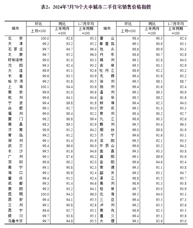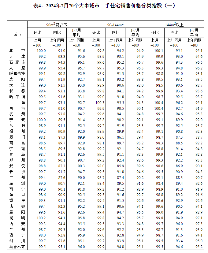 2024年7月份,商品住宅销售价格环比下降,同比降幅整体略有扩大,其中一线城市二手住宅销售价格同比降幅继续收窄。