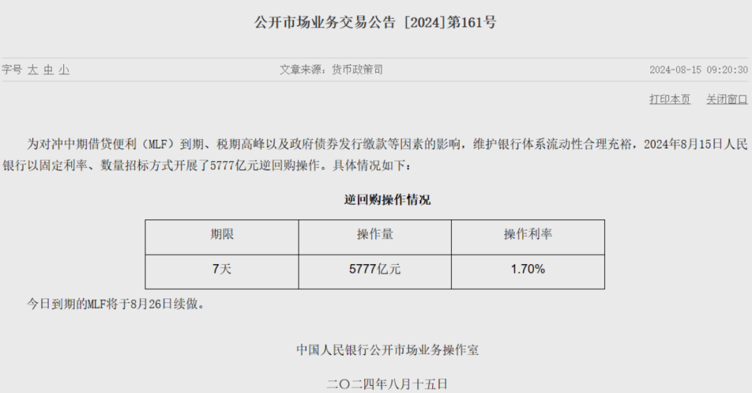 为对冲中期借贷便利(MLF)到期、税期高峰以及政府债券发行缴款等因素的影响,维护银行体系流动性合理充裕,人民银行(下称“央行”)8月15日以固定利率、数量招标方式开展了5777亿元逆回购操作。
