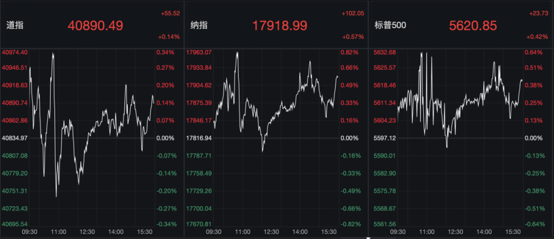 受美联储会议纪要、美国劳工统计局公布的非农就业初步修正数据影响,降息押注大幅升温,助推美股午盘转跌后走高,三大指数全线收涨,标普500指数涨0.42%,道指涨0.14%,纳指收涨0.57%。