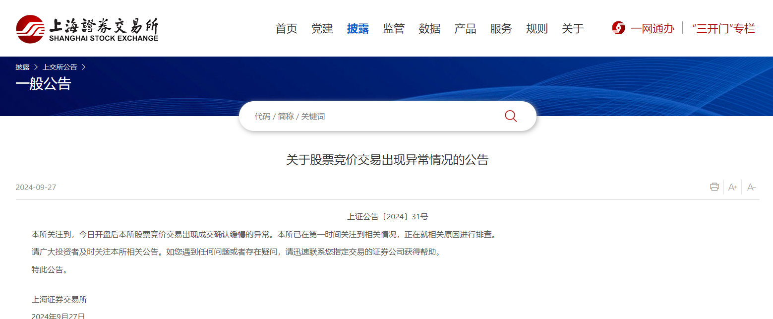 本所关注到,今日开盘后本所股票竞价交易出现成交确认缓慢的异常。本所已在第一时间关注到相关情况,正在就相关原因进行排查。